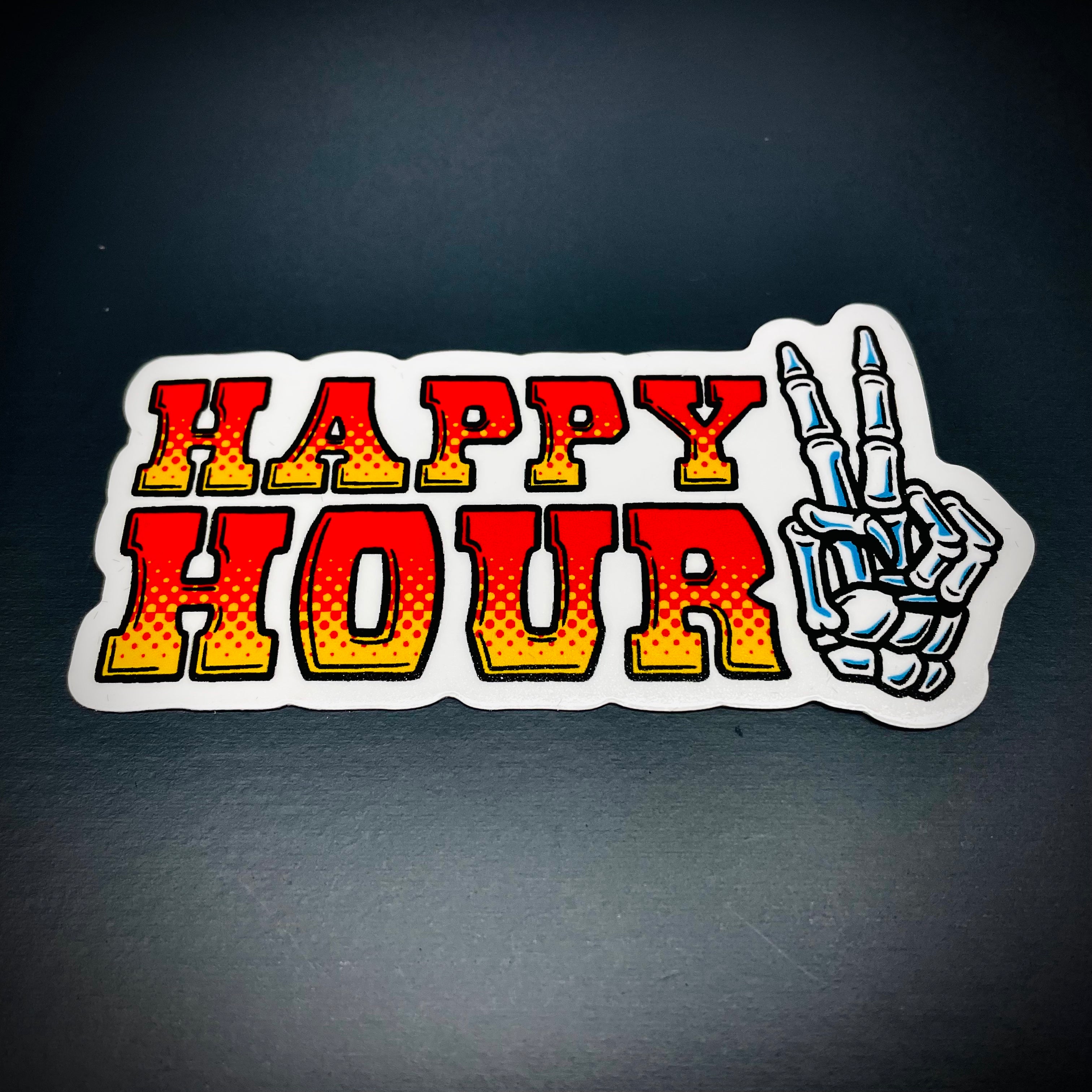 Happy Hour sticker in "saloon" font with skeleton peace sign on white vinyl.