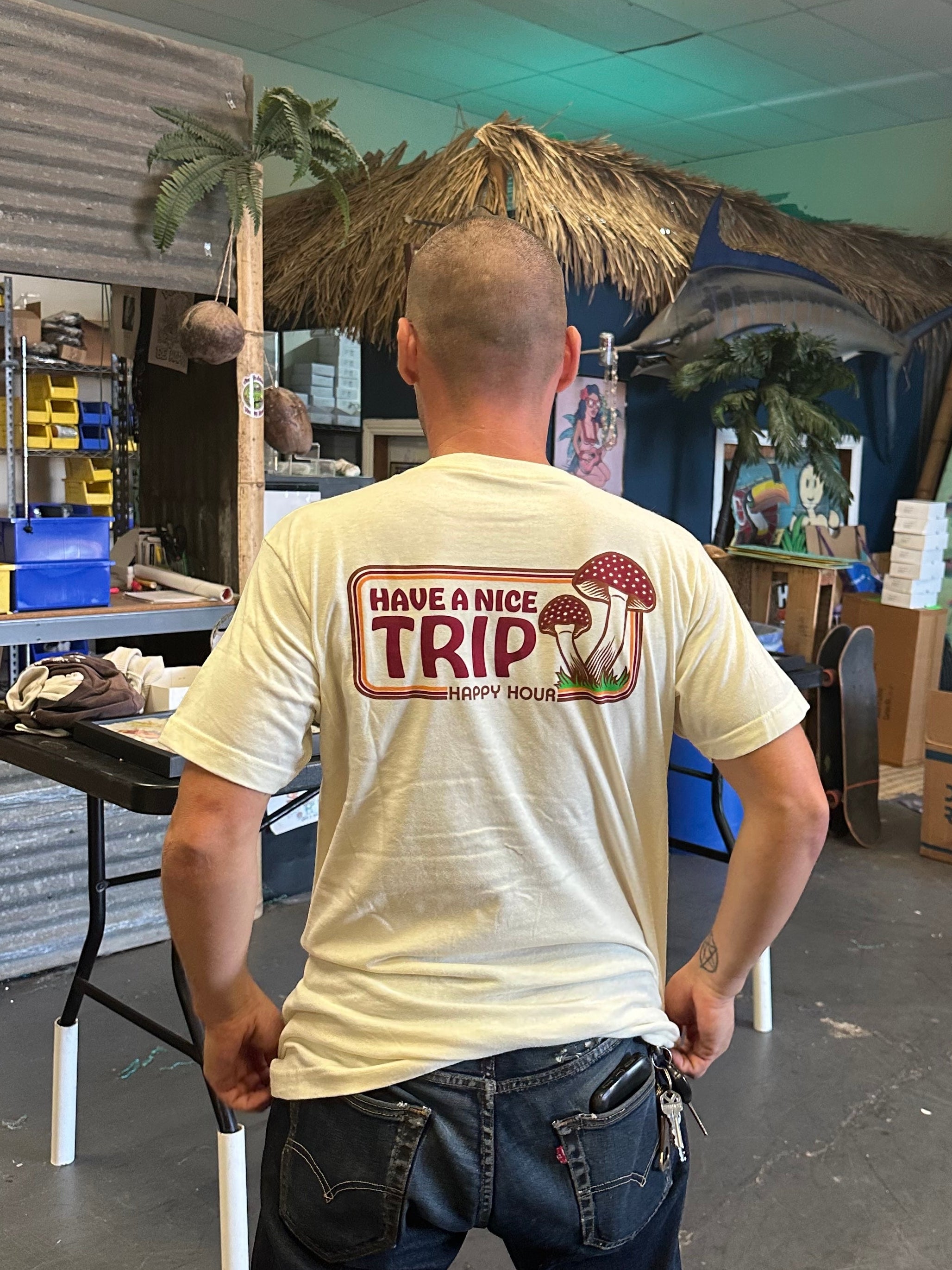 Happy Hour "Have a Nice Trip" Logo printed on Back.